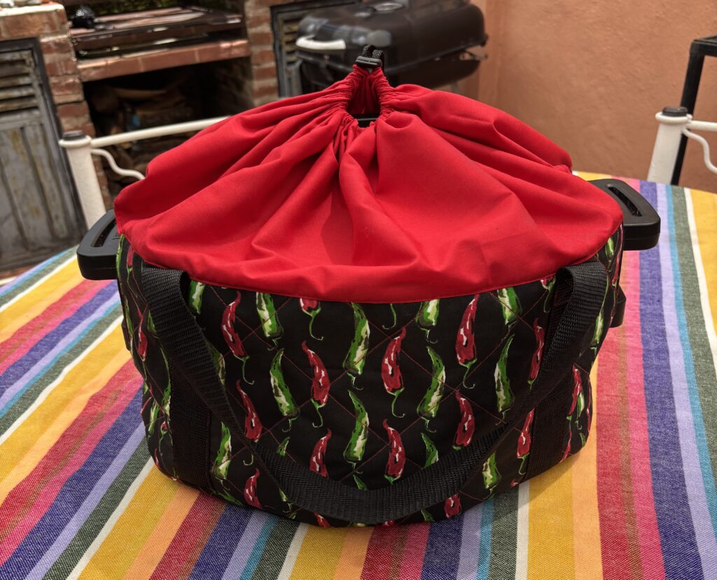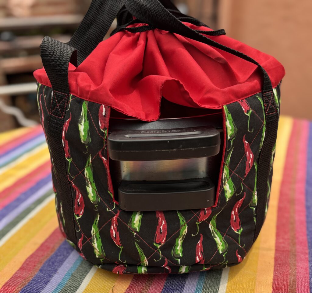 The bottom and sides of the carrier are quilted with heat safe interfacing (the same type of interfacing that's used for oven mitts). And the top of the carrier features a unique drawstring casing to keep your lid on as you transport the slow cooker.