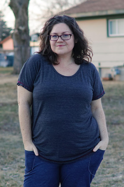 It's no surprise that The Everyday Tee is my very favorite top. I'm pretty sure making this one made put the number of them in my closet up to 8. One of the things about this pattern that makes me love it so much is the seam in the back that all I have to do is fold my yard of fabric in half and cut out the front on the fold and the back on the other side, super quick and easy because I don't have to refold the fabric! A seam up the back is also very helpful for some adjustments like swayback (link to a tutorial here), but not everyone needs that adjustment. So I'm going to show you how to eliminate the back seam.
